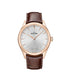 ساعة ديلما السويسريه رجالي هيرتيج ايطار معدني روز ذهبي مينا بيضاء زجاج كريستال ياقوتي ضد الماء 10ATM بطاريه مؤشر تاريخ حزام جلد بني