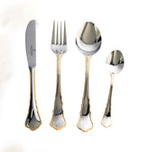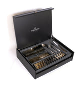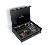 SOLINGEN COMPLETE CUTLERY SET FOR 12 PERSONS - 72 PIECES - STAINLESS STEEL - BRAND PICARD & WIELPUTZ ABOUT THIS ITEM BOX CONTENTS: 72-PIECE CUTLERY SET. WITH HOLLOW HANDLE KNIFE IN WOODEN CASE MANUFACTURED BY PICARD & WIELPUTZ GERMANY QUALITY CUTLERY ROUND OFF THE OVERALL LOOK OF A SET TABLE IN STYLE. STAINLESS STEEL 18/10 WITH DECORATIVE GOLD-PLATED CUTLERY BY PICARD & WIELPUTZ WITH HIGHER QUALITY HOLLOW HANDLE KNIVES LIGHTER AND MORE COMFORTABLE IN THE HAND. CONTENTS FOR: CUTLERY SET 72 PCS 12 DINNER SPOONS 2 MEAT FORKS 1 SAUCE SPOON 12 DINNER FORKS 2 VEGETABLE SPOONS 1 SOUP LADLE 12 DINNER KNIVES 1 CREAM SPOON 1 CAKE SERVER 12 COFFEE SPOONS 1 SALAD FORK 1 SUGAR SPOON 12 CAKE FORKS 1 SALAD SPOON 1 SUGAR TONGS ITEM WEIGHT 5.73 KG
